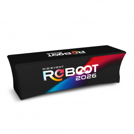 Large stretched polyester tablecloth that delivers a sleek, fitted look for events and expo displays. The stretch fabric wraps neatly around the table for a smooth, secure finish that stays in place throughout the day. With full-colour sublimation across the entire surface, it offers a clean, modern backdrop for presenting products, signage or promotional materials.